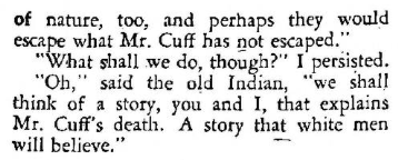 Wellman underlining once again what a fuckin’ piece of shit Cuff is for us. He makes the nameless Indian *swim* to shore! No question: Cuff is DEFINITLEY going to die now. One of the fun parts of weird fiction, for me, is the sense of the shape of the story coming along as you read it – we know that Cuff is in trouble, and Wellman WANTS us to know that, which is part of the pleasure – Cuff, that asshole, has no clue what’s about to happen to him!